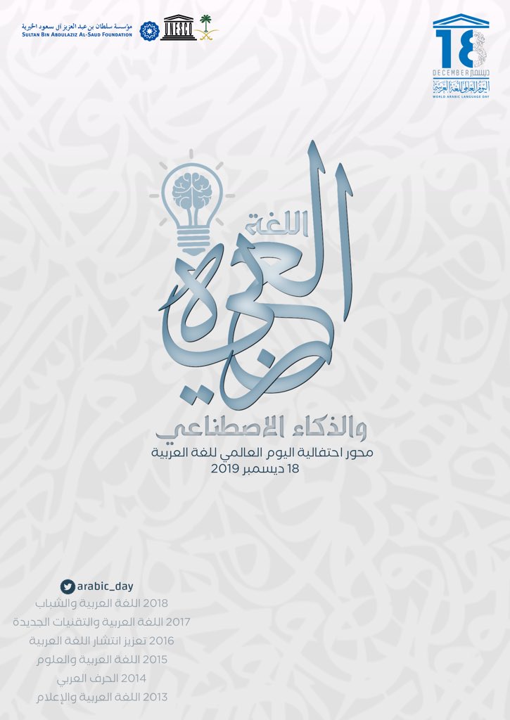 ي حتفى باليوم العالمي للغة العربية اليوم 18 كانون الأول ديسمبر 2019 وتستضيف اليونسكو بهذه المناسبة ثلاث موائد مستديرة مخصصة لموضوع هذا العام الذي يحمل عنوان اللغة العربية والذكاء الاصطناعي ويليها حفل موسيقي يقام في.